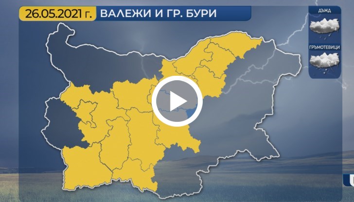 В 14 области от страната е в сила предупреждение за значителни количества, силни гръмотевични бури и опасност от градушки и през нощта, и утре, когато валежите ще продължат.