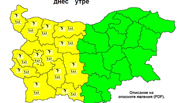 Жълт код е обявен в 13 области на Западна и Централна България за гръмотевични бури и валежи. Това са областите Видинска, Монтанска, Врачанска, Плевенска, Ловешка, София област, София град, Пернишка, Кюстендилска, Благоевградска, Пазарджишка, Пловдивска и Смолянска.