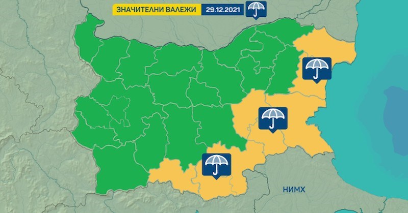 Предупреждението важи за областите Добрич, Варна, Бургас, Сливен, Ямбол, Хасково, Кърджали и Смолян.