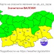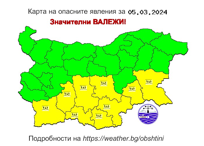 Във вторник е обявен жълт код за значителни валежи в 9 области от Югозападна, Южна и Югоизточна България: Бургас, Ямбол, Стара Загора, Хасково, Кърджали, Пловдив, Смолян, Пазарджик, Благоевград.