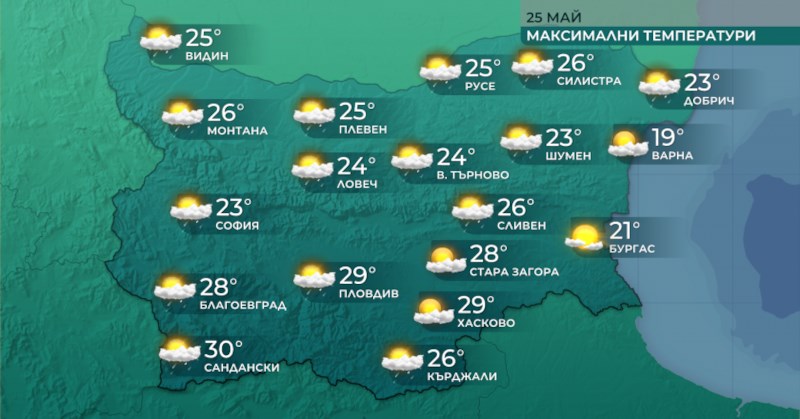С умерен северозападен вятър ще проникне по-студен въздух и температурите ще са от около 20° по морския бряг, до 30° в крайните югозападни райони.