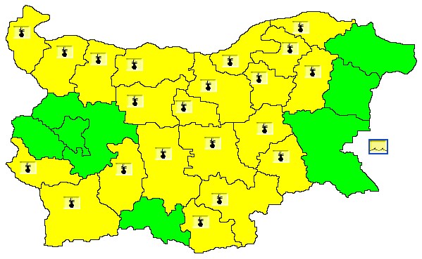 Жълт код за потенциално опасно време е обявен за областите: Видин, Монтана, Кюстендил, Благоевград, Пазарджик, Враца, Плевен, Ловеч, Пловдив, Велико Търново, Габрово, Стара Загора, Кърджали, Хасково, Ямбол, Сливен, Търговище, Русе, Разград, Шумен, Силистра