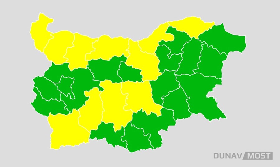 Жълт код за опасни горещини бе обявен за 11 области в страната. Предупреждението, издадено от НИМХ, е за областите Благоевград, Видин, Монтана, Враца, Плевен, Велико Търново, Русе, Силистра, Стара Загора, Пазарджик и Пловдив.