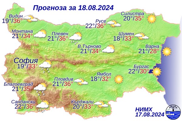 На 18 август 2024 година времето в България ще предложи разнообразие от метеорологични условия, в зависимост от региона. Националният институт по метеорология и хидрология (НИМХ) прогнозира, че денят ще започне предимно слънчево, но следобедните часове ще донесат облаци и валежи в западната част на страната.