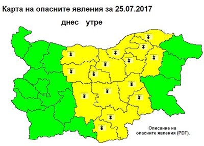Областите, за които е в сила предупреждението са: Плевен, Велико Търново, Русе, Разград, Силистра, Шумен, Търговище, Габрово, Ловеч, Сливен, Стара Загора, Пловдив, Ямбол, Хасково и Кърджали. Времето в тези области ще бъде горещо, като се очаква температурите да достигнат порядъка 35-37 градуса.