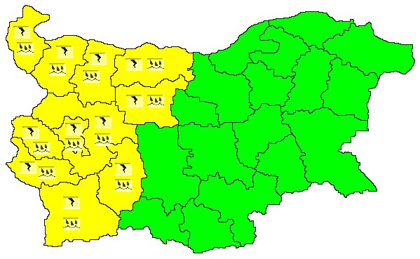 Жълт код е издаден за 11 области на страната за утре, 24 юни. Това сочи справка в сайта на НИМХ. Предупреждението е в сила за София град, София област, Видин, Монтана, Враца, Плевен, Ловеч, Перник, Благоевград, Кюстендил и Пазарджик, пише агенция Фокус.