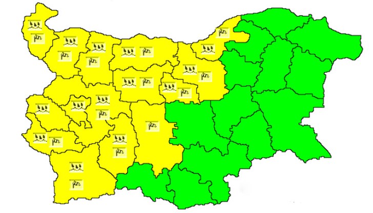 Обявиха жълт код за значителни валежи и усилване на вятъра в Западна и голяма част от Централна България в четвъртък.
