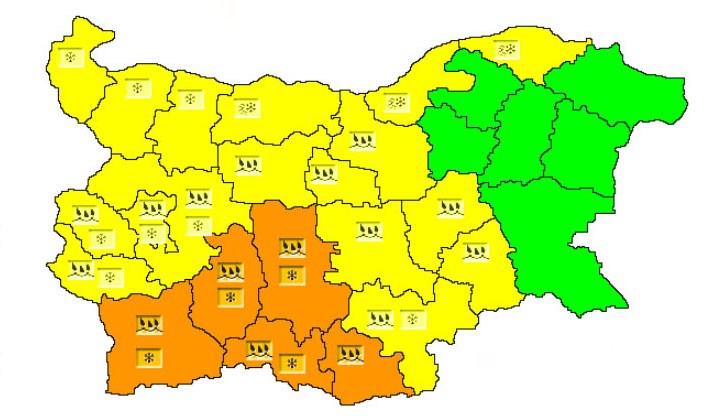 Жълт код заради обилни валежи от сняг е в сила за областите Видин, Монтана, Враца, Плевен, Русе и Силистра. В тези райони ще има валежи от дъжд, ще застудява. След обяд дъждът ще преминава в сняг и има условия за поледици.
