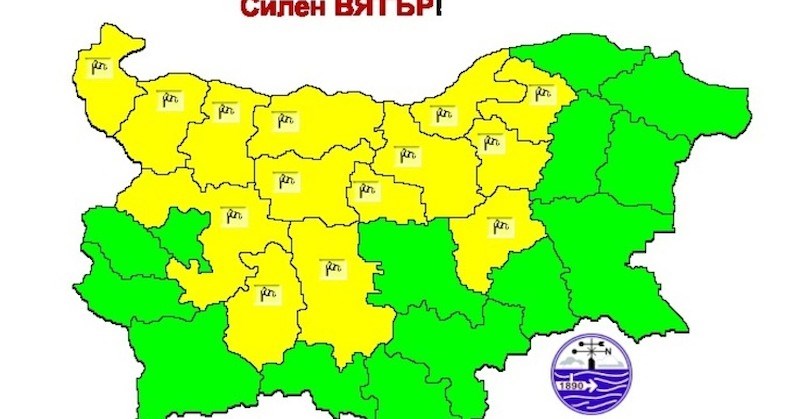 Жълт код за силен вятър е обявен за днес 4 февруари в 14 области в страната, съобщава на сайта си Националният институт по метеорология и хидрология (НИМХ). Кодът е в сила за областите Велико Търново, Видин, Враца, Габрово, Ловеч, Монтана, Пазарджик, Плевен, Пловдив, Разград, Русе, Сливен, София област и Търговище. Очаква се скоростта на вятъра да достига 50-70 километра в час, а поривите му и до 90 километра в час, предава БТА.