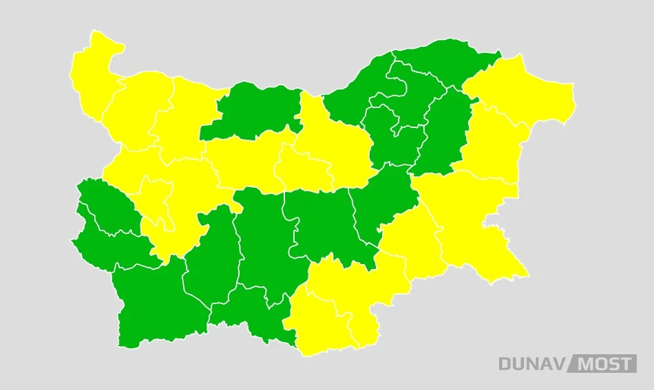 В 14 области на България е в сила предупредителен жълт код. За три от тях – Видин, Враца и Монтана, предупреждението е комплексно за снеговалежи и бурен вятър. В останалите 11 области, покриващи Северна и Източна България, кодът е за силен южен вятър, който ще донесе рязко затопляне, но и потенциални опасности.