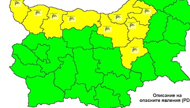 Предупреждението за ниски температури е в сила за областите Видин, Монтана, Враца, Плевен, Велико Търново, Сливен, Русе, Търговище и Разград.