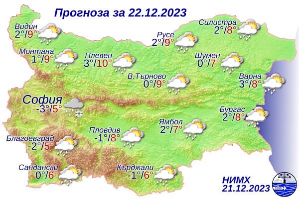 През нощта ще бъде предимно ясно, но след полунощ от запад облачността ще започне да се увеличава. Ще духа слаб югозападен вятър. Минималните температури ще са между минус 3° и 2°, по Черноморието малко по-високи, в София – около минус 3°. На 22 декември в 5 ч. и 27 мин. настъпва астрономическата зима.