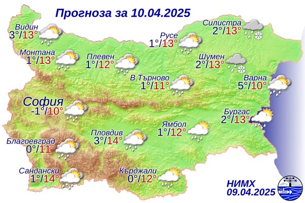Атмосферното налягане през деня ще се понижи значително и ще бъде под средните стойности за месец април. Минималните температури през нощта ще варират между минус 2 и 3 градуса, като в столицата се очаква да бъдат около минус 1 градус. Временно западният вятър ще отслабне, а облачността ще се разкъса и намалее, оставайки по-значителна само над източните райони на страната.
