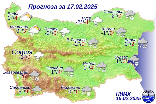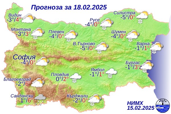 Температурите ще са типично зимни – между -3°C и 2°C сутринта, а през деня - от 0°C в Североизточна България до 9-11°C в Югозападна България. В Русе и региона ни очаква снежен пейзаж с температури около 0°C.