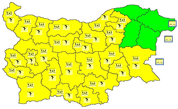 Националният институт по метеорология и хидрология (НИМХ) обяви жълт предупредителен код за интензивни валежи от дъжд, придружени с гръмотевици и временно усилване на вятъра за 17 май.