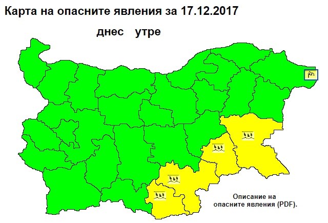 Кодът е в сила за областите Кърджали, Хасково, Ямбол и Бургас. В тези райони количеството на валежа ще достигне около и над 20 л/кв.м.