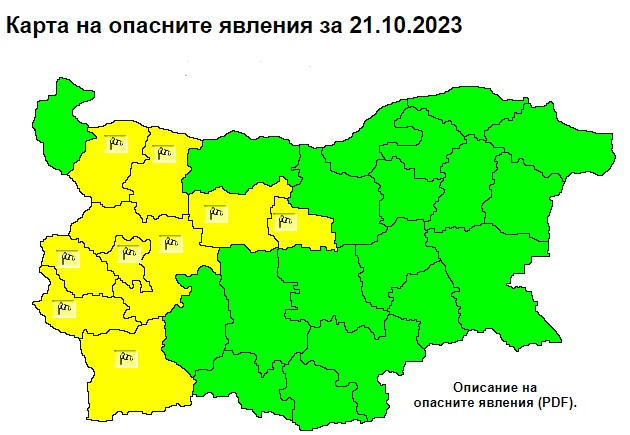 През деня отново ще духа силен южен вятър и в 9 области на Западна България остава в сила жълт код за опасно време - Монтана, Враца, Ловеч, Габрово, София област, София-град, Перник, Кюстендил и Благоевград.