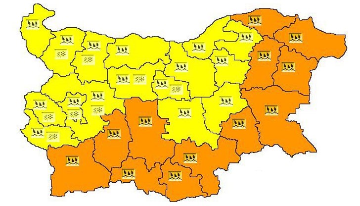 "Оранжев" код за валежи с количества между 30 и 50 л/кв. м, в отделни райони - и повече, е обявен за 12 области - Благоевград, Пазарджик, Смолян, Пловдив, Кърджали, Хасково, Ямбол, Бургас, Варна, Шумен, Добрич и Силистра.