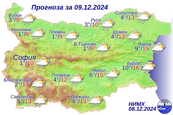 В планинските райони с надморска височина над 1700 метра валежите ще бъдат снежни. Според синоптиците, следобед валежите постепенно ще отслабнат и ще спрат, а облачността ще се разкъса.