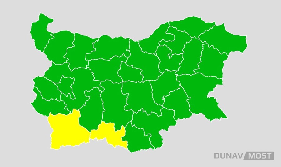 Националният институт по метеорология и хидрология (НИМХ) обяви жълт код за интензивни валежи в областите Благоевград и Смолян за утре, 9 декември. Предупреждението е издадено поради очакваните значителни количества валежи, които ще достигнат между 20 и 35 литра на квадратен метър.