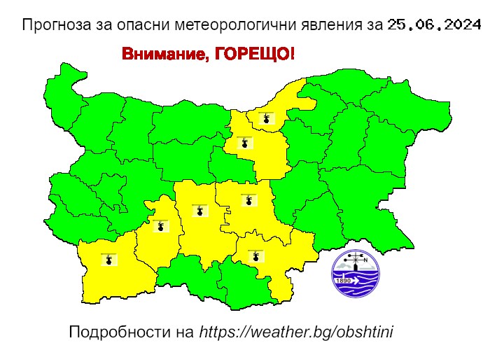 Отново е в сила предупреждение от първа степен за опасни горещини в областите Русе, Велико Търново, Стара Загора, Пловдив, Пазарджик, Хасково, Кърджали и Благоевград.