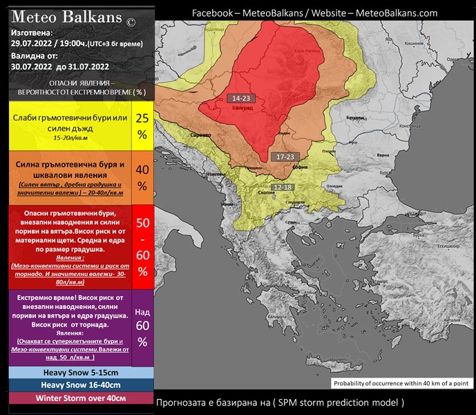 Екипът на MeteoBalkans издава карта с предупреждения за опасно време, които са валидни за събота . (Забележка: Опасните явления ще са късно следобед и през нощта срещу неделя , и то на отделни райони. Картата показва районите, където те са най-вероятни, но бурите няма да покриват цялата площ.)