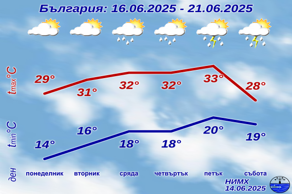 "Времето ще остане сравнително топло за средата на юни със слънчеви периоди и временни увеличения на облачността", съобщават от НИМХ в седмичната прогноза.