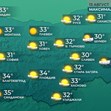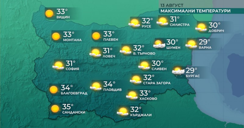 Днес ще бъде предимно слънчево. Временни увеличения на облачността ще има преди обяд над Източна България, а след пладне над централните райони и планините. Ще бъде почти без валежи. Ще духа слаб изток-североизточен вятър и с него дневните температури слабо ще се понижат и преобладаващите максимални ще са между 30° и 35°. Атмосферното налягане ще се задържи по-високо от средното за месеца.