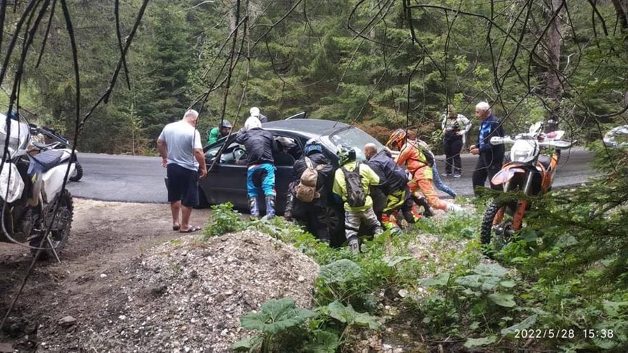 За щастие инцидентът се е разминал без пострадали и сериозни повреди по автомобила. Група мотористи са се притекли на помощ и с общия усилия са върнали автомобилът на пътя.