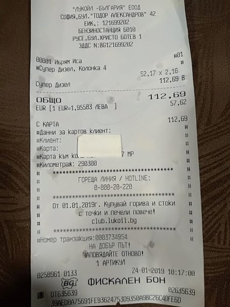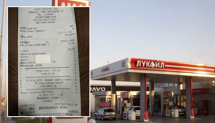 Диана Донева снимала касовата бележка от днес, на която пише, че е заредила 52,17 литра за 112,69 лева. Младата жена твърди обаче, че резервоарът на автомобила е с обем от 45 литра.