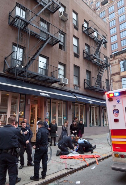 71-годишна жена е в болница с тежки травми, след като жена е скочила от третия етаж на сграда в Манхатън, Ню Йорк и се стоварила върху нея.