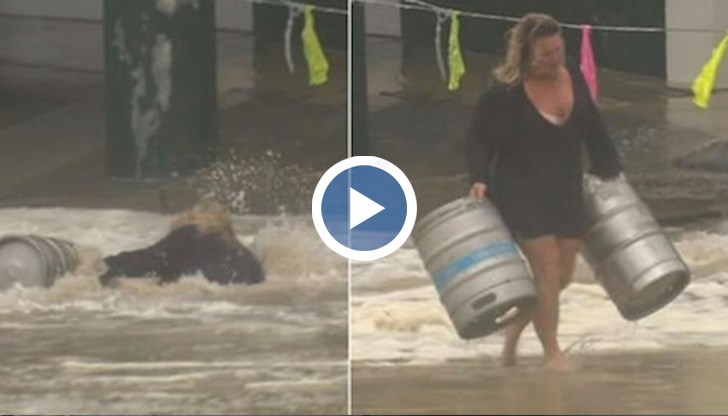 Жената, по всяка вероятност служителка на бара, бе заснета от свидетели да се хвърля с дрехите във въртопа на залялата брега вода и после да измъква с двете си ръце обемистите и по всяка вероятност тежки “бурета” с пиво, пише Gospodari.com.
