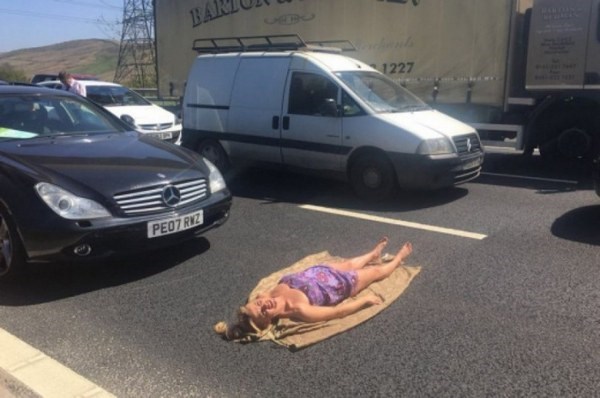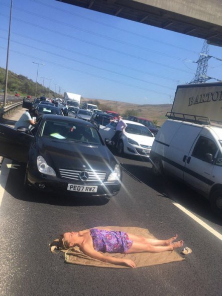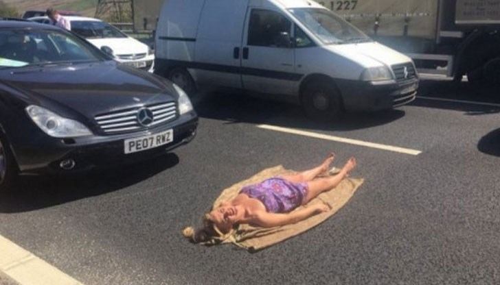 Англичанката Лили Уилитс реши да извлече най-доброто от една лоша ситуация и с това събра погледите на околните. Великобританката и приятеля ѝ заседнали в тричасово задръстване на магистрала, когато жената решила просто да легне между колите на платното и да си прави слънчеви бани.