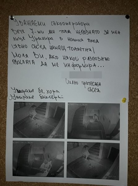 Съседи от блок в столичен квартал успяха да изловят със скрита камера жена, която редовно уринира във входа.