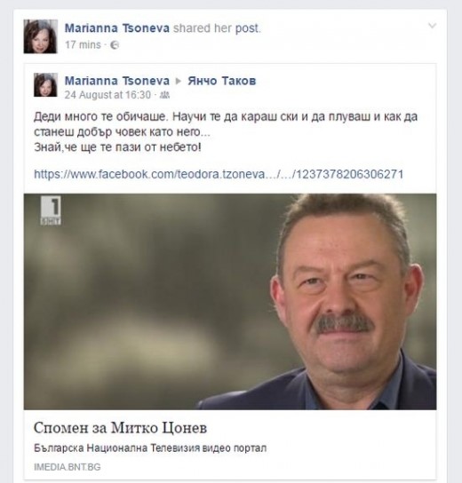 Преди дни Марияна бе публикувала на стената на детето линк към филма-спомен за дядо му с думите: "Деди много те обичаше. Научи те да караш ски и да плуваш и как да станеш добър човек като него... Знай, че ще те пази от небето!".