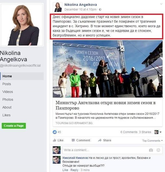 В профилът на министъра на туризма Николина Ангелкова е била поместена статия ( пиша поместена, защото в момента въпросната статия и това изказване не съществуват) по въпроса с откриването на зимния сезон в Пампорово.