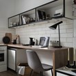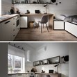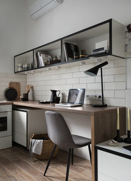Дървеният плот продължава до кухнята. Дълъг прозорец позволява на естествената светлина да огрява малкия апартамент.