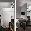 На една крачка от антрето откриваме общо пространство, което съчетава спалня, бюро и кухня. Зад частична стена е зоната за сън.