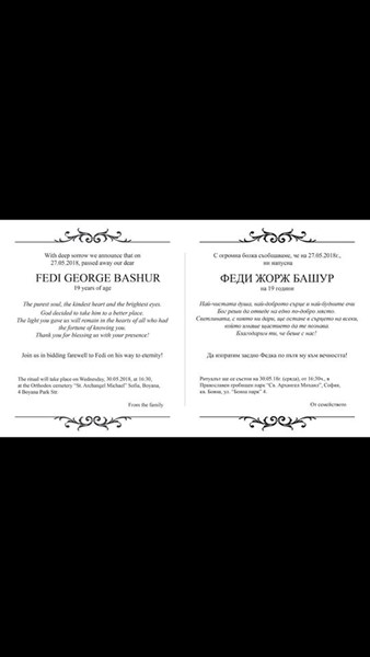 Днес той сподели некролога на сина си в социалната мрежа и с няколко думи опита да опише огромната болка, която разкъсва сърцето и душата му.