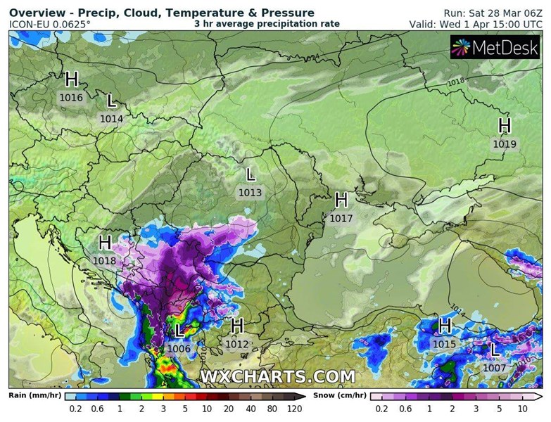 У нас до обадя над Западна и Северозападна България ще започнат и валежи, отначало в Западна България, а през нощта срещу сряда (1-ви април ) дъжда над Северозападна България ще премине в сняг. Валежи от сняг, очакваме и над Западна България, като границата между дъжд и сняг ще е между 400-600 метра надморска височина.