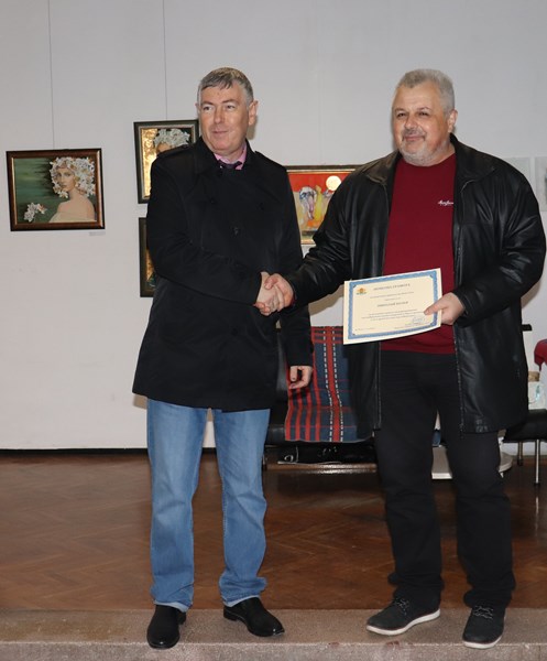 Поздравления към художниците бяха отправени и от името на кмета Пенчо Милков. На събитието присъства и председателят на Дружеството на художниците в Русе Николай Колев, който пожела на останалите участници още дълги години да радват и провокират жителите и гостите на града. Вчера той отбеляза и своя 60-и рожден ден. В знак на уважение и признателност към дългогодишната му дейност той бе удостоен с почетна грамота от областния управител Данаил Ковачев. Отличието му бе присъдено за цялостен принос към развитието на изобразителното изкуство в Русе и региона. Той е автор на над 50 изложби в страната и чужбина, а негови картини има в редица частни колекции в Европа, Австралия, Северна и Южна Америка.