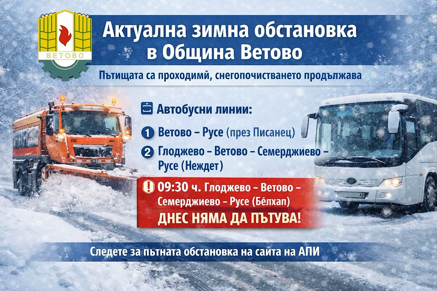 След като кризата с електрозахранването във Ветово и Писанец бе успешно овладяна рано тази сутрин, фокусът на местните власти се премести изцяло върху зимното поддържане на пътищата. Въпреки официалните уверения за спокойна обстановка и активно снегопочистване, реалността за пътуващите се оказа по-сложна, след като ключова автобусна линия до областния център бе отменена.