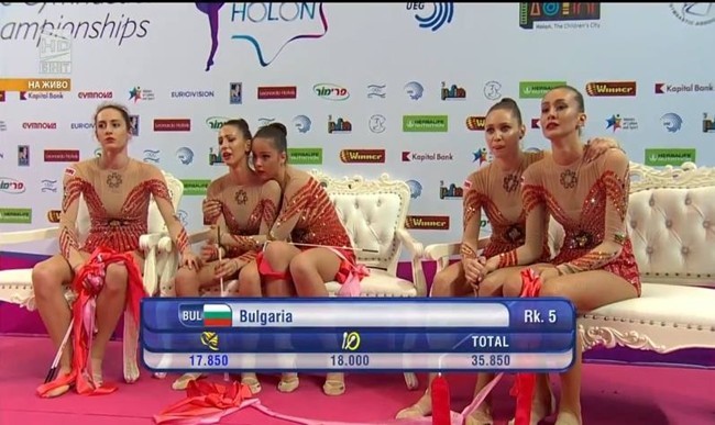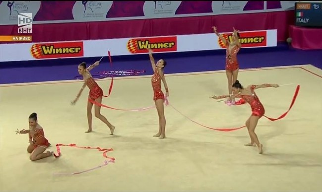 Оценката от 17,850 за съчетанието с пет ленти позволи на италианките да минат пред нас в многобоя. Шампион е Русия, сребърните медали са за ансамбъла на Беларус, а бронзът отиде при домакините от Израел.