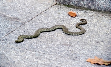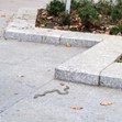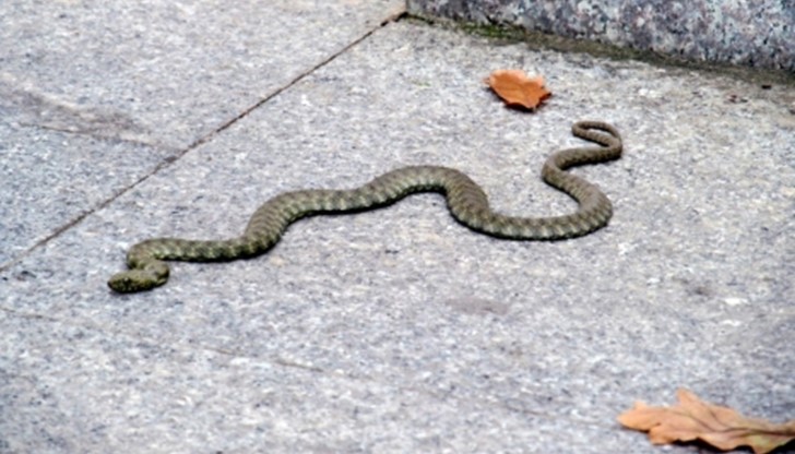 Малка змия изненада русенци, възползвайки се от хубавото време и припичайки се на плочките до Кръглия шадраван на централния площад "Свобода" в града.