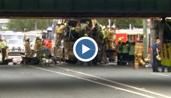 Зрелищна катастрофа – автобус се заклещи в мост