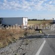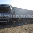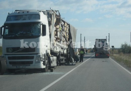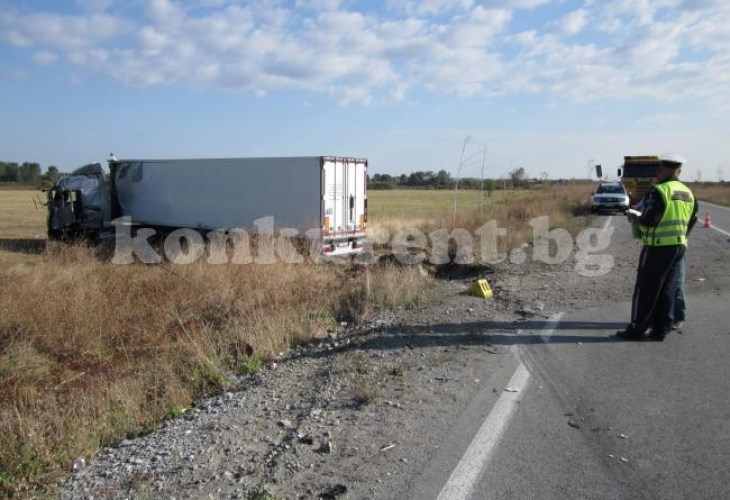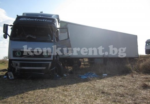 За щастие на водачите, при сблъсъка няма ранени, но пораженията по камионите са огромни. Тежка техника ще трябва да извади турския ТИР от нивата, в която е влетял след удара.