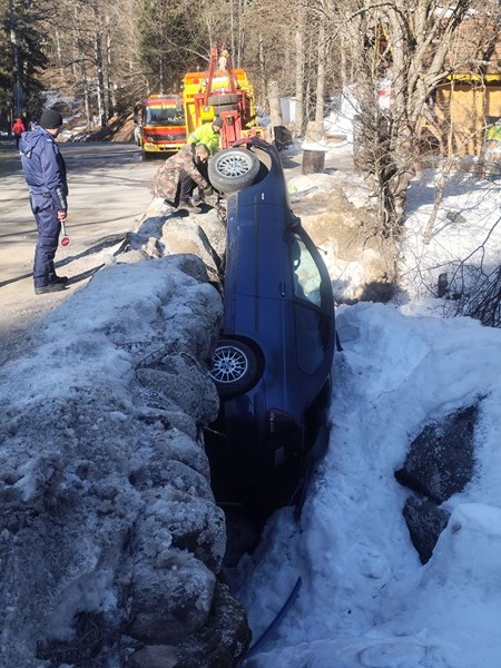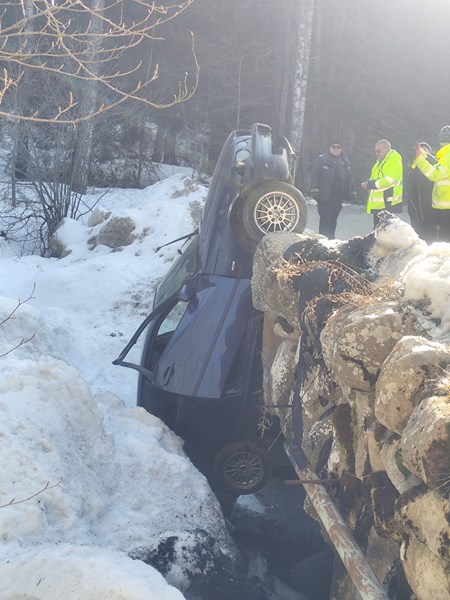 В следствие на падането автомобилът е застанал във вертикално положение между скалите.