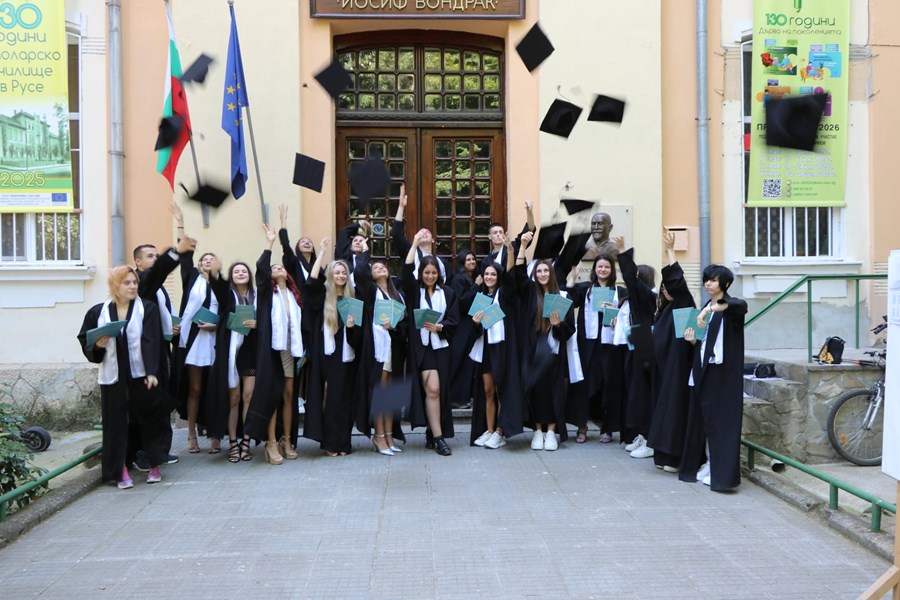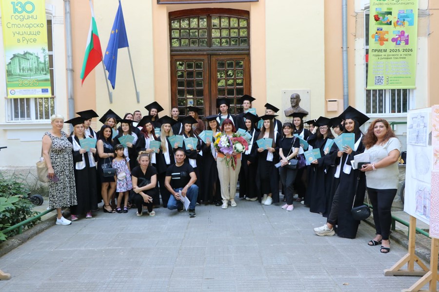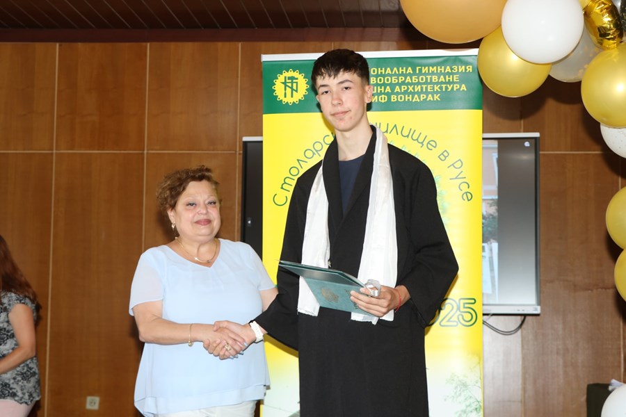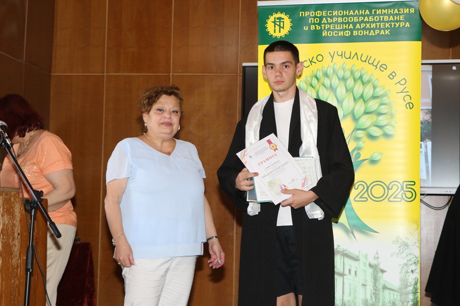 В аулата на ПГДВА „Йосиф Вондрак" се състоя тържествената церемония за връчване на дипломите за завършено средно образование и свидетелствата за професионална квалификация на зрелостниците от випуск 2025. Събитието отбеляза успешното завършване на младежите от специалностите „Интериорен дизайн", „Мебелно производство" и „Полиграфия".