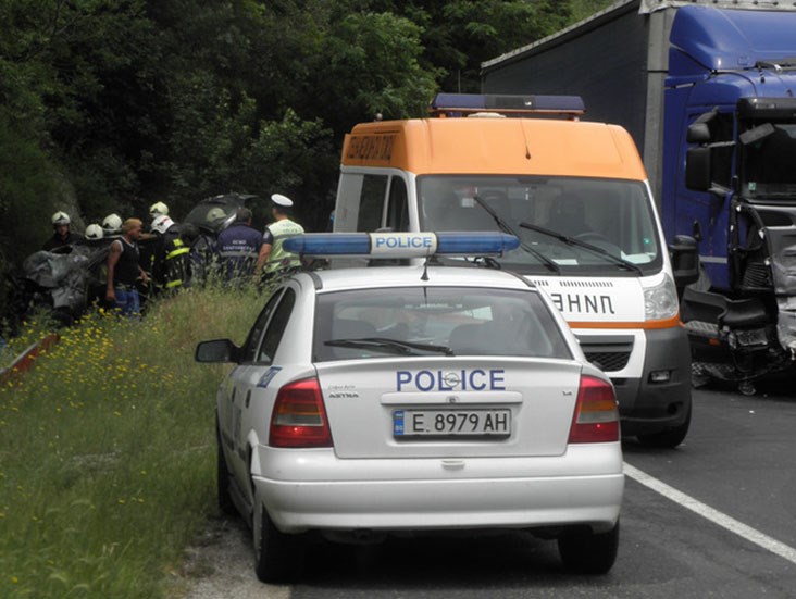 Забранено е движението в едната лента. При инцидента са се ударили ТИР и лек автомобил. Пострадали са двама души.